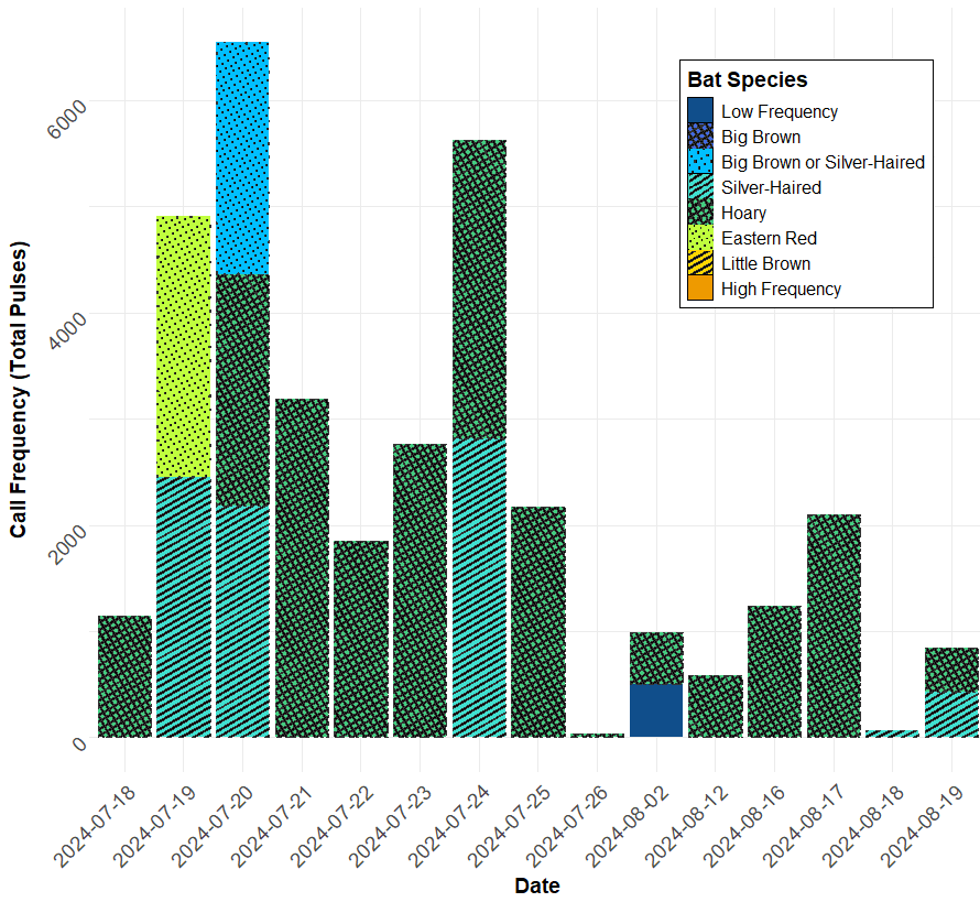 Another important note is that call frequency is not a proxy for abundance. Some bat species simply call more frequently than others, and a single bat may pass the microphone multiple times, with each pass counting as a detection. This variability makes it important to interpret results carefully.